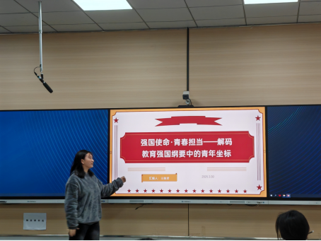 3月30日,各班团支书组织全班同学开展了以“强国使命·青春担当——解码教育强国纲要中的青年坐标”为主题的班会,深入学习了《教育强国建设规划纲要(2024—2035年)》。通过系统解读教育强国的战略定位和核心任务,同学们的爱国报国意识得到了进一步强化。在教育强国的建设进程中,青年一代肩负着至关重要的责任与使命。青年不仅是国家未来的栋梁,更是实现中华民族伟大复兴的中坚力量。新时代的青年应积极践行爱国与报国的核心价值观,将个人成长与国家发展紧密融合。此次班会不仅深化了同学们对教育、科技、人才三位一体战略的认同感,也激励大家将个人发展融入国家发展的大局之中。