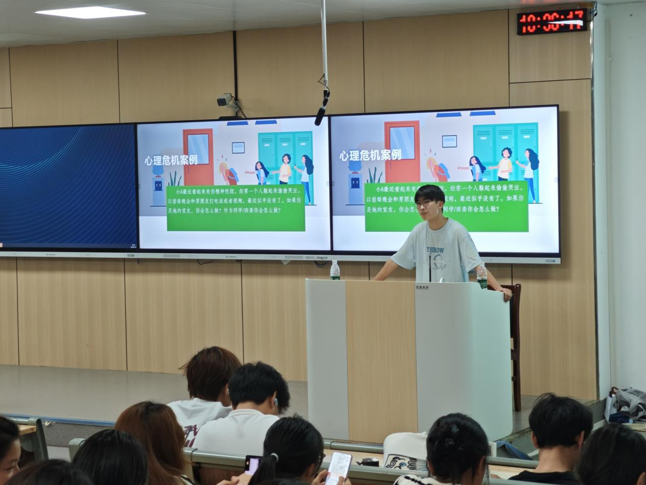 在“心理危机案例讨论”环节,班会通过真实案例模拟了危机信号的识别与初步介入行动。案例中的学生小A表现出情绪低落、社交退缩等典型信号,同学们分组讨论了作为室友、同学或班委应如何应对。大家一致认为,第一步是主动关心,以真诚的态度开启对话,例如表达“我很担心你,能和我说说发生什么了吗?”同时,班会强调了介入的边界把控,既要避免过度干预,也要杜绝冷漠回避,并在必要时及时转介专业资源。这一环节增强了同学们的实践能力,让大家在面对类似情况时能够更加冷静和科学地应对。