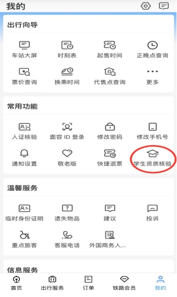 1.打开“铁路12306”APP,在“我的”常用功能中找到“学生资质核验” 专区,点击进入。