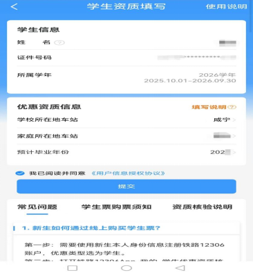 3.核验成功后,该页面会自动显示出当前用户的姓名(支持修改调整)、证件号码、所属学年信息。需要学生旅客如实填写学校所在地车站、家庭所在地车站、预计毕业年份等信息。